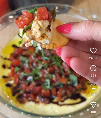 - Top the Boursin cheese layer with the bruschette and garnish with a drizzle of balsamic glaze and olive oil. We