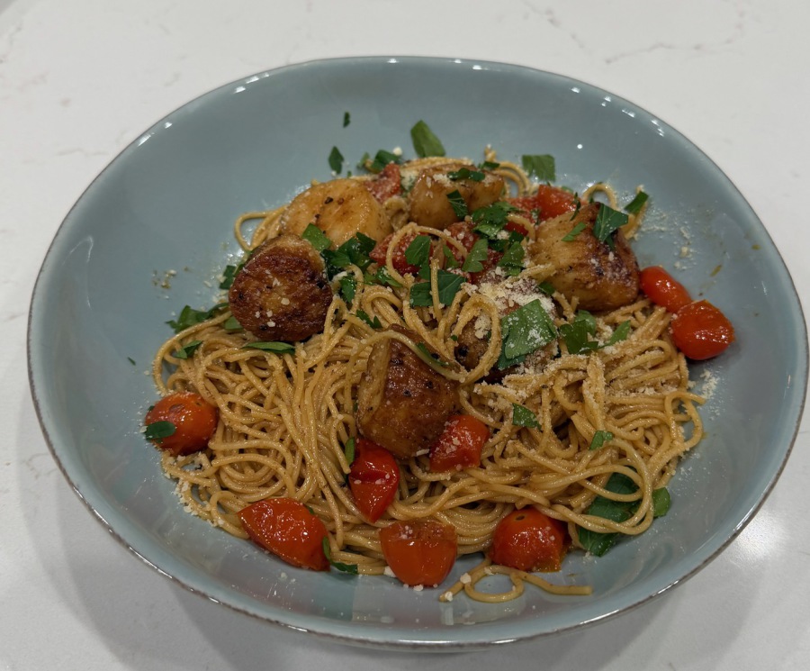 14.Plate the pasta and scallops, drizzling any remaining sauce over the top. Optionally, sprinkle with grated Parmesan cheese.